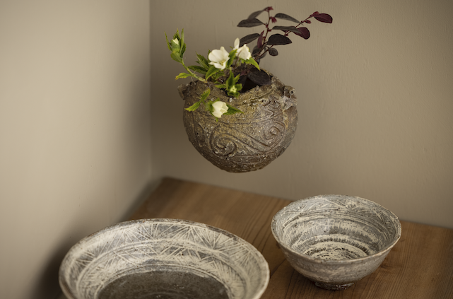 田中さんが命名した縄文唐津!の掛け花入れは大胆な彫模様が楽しいです。